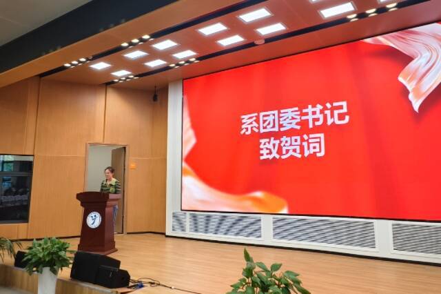 校学生会主席团代表胡子豪上台致辞。致辞中,他表达了对学校和系部学生会未来工作的期望,希望双方能够进一步加强交流合作,携手共进,为学生们创造更多学习、成长和锻炼的机会。