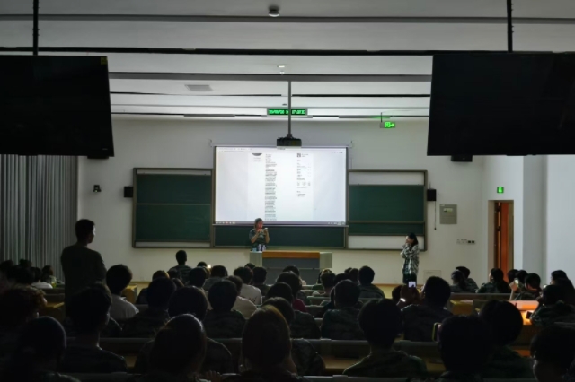 随后,军歌学唱环节正式开启。教官逐句领唱,新生们认真跟学,从发音咬字到节奏把控,大家全神贯注投入其中。尽管教室空间有限,但新生们坐姿端正、精神饱满,眼神中满是专注与热情。遇到节奏复杂的段落,教官耐心示范,反复指导,还邀请节奏感强的同学起身领唱,带动整体氛围。随着熟悉的旋律逐渐响起,越来越多的新生放开歌喉,整齐嘹亮的歌声在教室内回荡,展现出信息工程系新生昂扬向上的精神风貌。