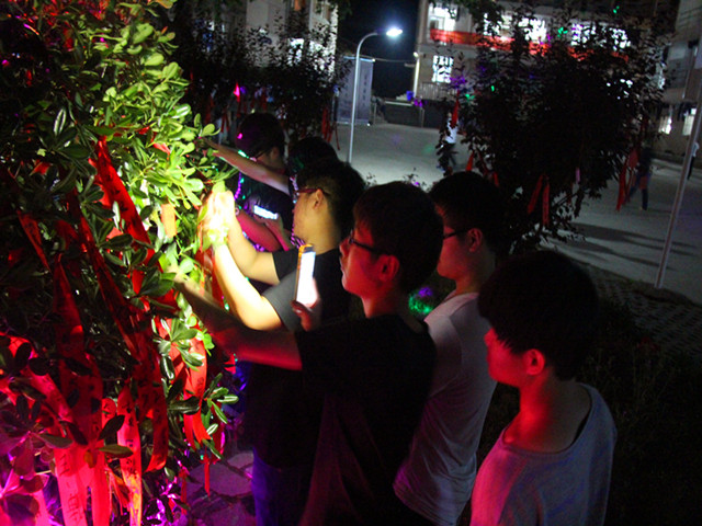 夜晚,许愿树炫目的光彩更成了学生公寓里的一道亮丽的风景,她带着同学们的祝福,怀揣着大家的梦想,绽放最耀眼的的光芒,承载着我们的希望永不言弃。