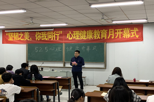 5月7日中午12:30,由大学生健康成长中心主办的 “坚韧之美,你我同行” 第九届5.25心理健康教育月开幕式及主题讲座在教学楼C105举行。学工处处长张宝中老师、处长助理殷凯老师、电子工程系心理气象站杨瑞老师、信息工程系心理气象站王林林老师、自动化工程系心理气象站袁佳老师、大学生健康成长中心老师以及全体心理委员、大学生心理健康协会成员参加了本次活动。