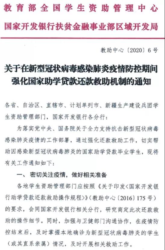 关于在新型冠状病毒感染肺炎疫情防控期间强化国家助学贷款还款救助机制的通知