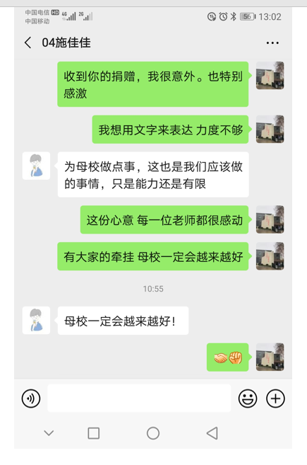 在全国上下众志成城、抗击疫情的关键时期,校友们的捐赠缓解了学校防控物资紧张的问题,这是广大校友心系母校、感恩母校的实际行动,更是广大校友秉承“知行合一 自强不息”校训精神、展现社会责任和企业担当的善行义举,这不仅是助力我校打赢疫情防控阻击战的物质支持,也是对全校教职工的巨大精神鼓舞。