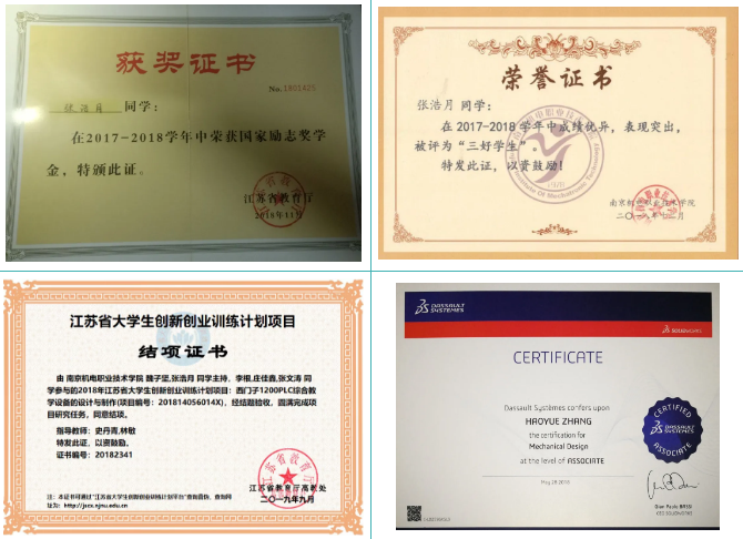 大学期间,专业成绩排名系部第二名,综合素质测评排名第一。在班级担任班长、院资助宣传大使,曾任江南网页版单片机社团社长、蓝岛创客工坊学生负责人等。曾获得国家奖学金、国家励志奖学金、全国大学生挑战杯江苏赛区三等奖、中英STEAM江苏赛区最佳编程奖、江苏省大学生创新创业训练计划结项证书、学院奖学金、学院三好学生、学院优秀学生干部、学院优秀共青团员、社团之星、“一二九大合唱”二等奖、优秀标兵等荣誉称号。同时本人获得院优秀社会实践团队、优秀社会实践个人的荣誉称号、“欧帝杯”三创大赛优秀奖等。我所在班级在2018-2019学年被评为“江苏省省级优秀班集体”,“南京市五四红旗团支部”。