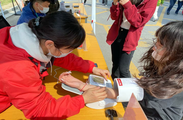 工作人员提前在活动场地布置好所用器材,在中午活动到达了一个高潮,现场人来人往,每当有老师或者学生前来测量,工作人员始终保持热情的笑容服务师生,积极向同学们宣传健康饮食小知识,并耐心地讲解测血压的注意事项。在活动过程中,工作人员为每位前来测量的师生认真检测,记录相关数据,了解生活习惯,悉心解释血压情况,并结合情况给予相关建议,健康饮食,多多锻炼,公益测血压,健康你我他。