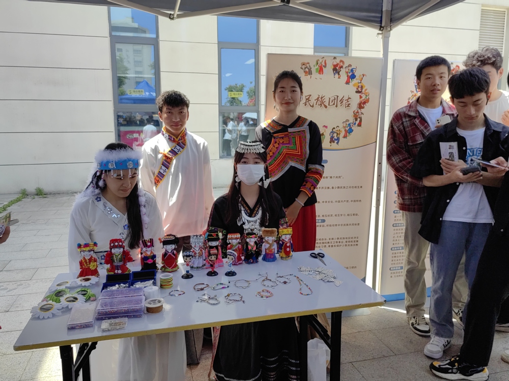 红石榴班的同学们展示民族经典的服饰、语言及风情文化,吸引众多学生驻足欣赏与交流。现场许多同学对编制民族特色手链和饰品兴趣浓厚,纷纷参与互动活动中。
