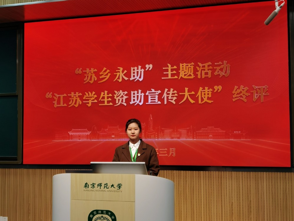 “苏乡永助”资助育人主题活动由江苏省教育厅主办,旨在助力青年深入学习贯彻习近平新时代中国特色社会主义思想,大力宣传国家资助政策及成效,切实做好学生资助工作,提升资助育人实效,激励广大受助学生奋发自强、立志成才、感恩回馈、为国奉献。此次评选全省各高校推荐申报139名参赛选手,经省教育厅组织专家进行材料审核、初选、现场汇报和答辩环节,最终50名优秀学子脱颖而出,荣获“江苏学生资助宣传大使”荣誉称号。