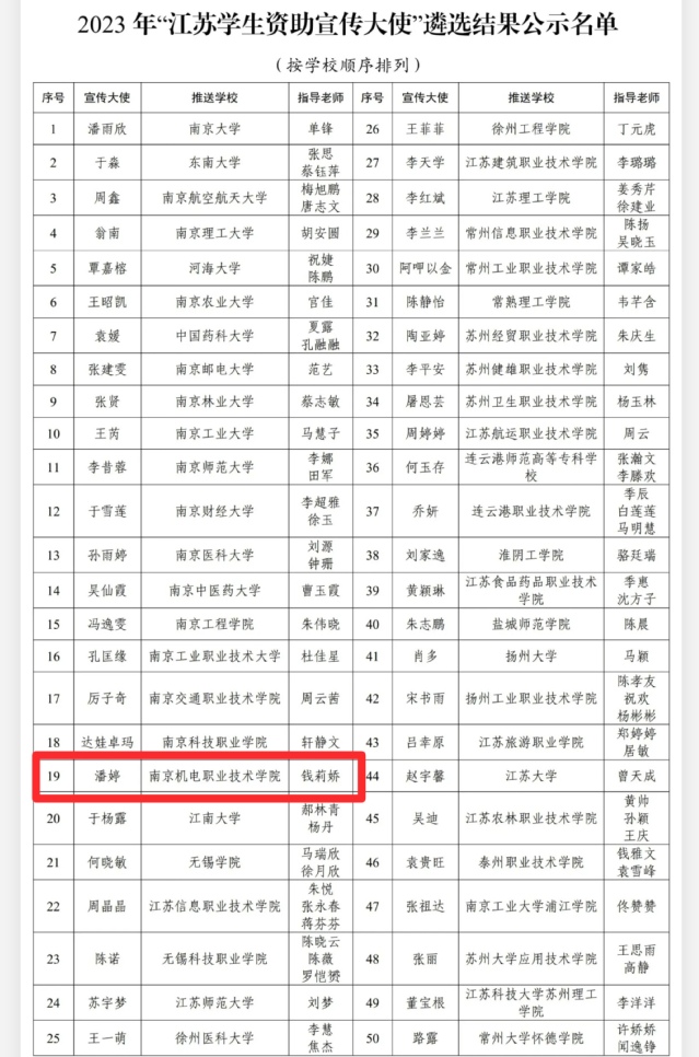近日,江苏省2023年“苏乡永助”资助育人主题活动结果公布,我校20级学生潘婷同学获评“江苏学生资助宣传大使”荣誉称号,这是我校学子首次获此荣誉。