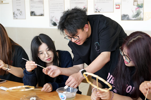 同学们一步步地亲手体验手工缫丝,感受缫丝剥茧的奇妙过程。一时间,缠绕着蚕丝的团扇上下翻飞,蚕丝不仅不断还非常均匀,团扇上渐渐形成了一层半透明的蚕丝扇面。