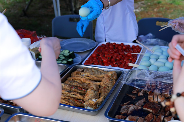 据说端午吃“五红”也是为了防“五毒”,活动现场特意为同学们准备了好吃的“五红”,分别有烤鸭、龙虾、红烧肉、苋菜、红油鸭蛋,吸引了同学们纷纷前来品尝美味。