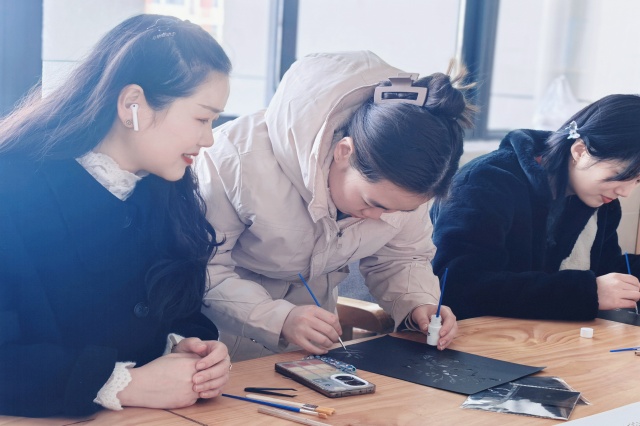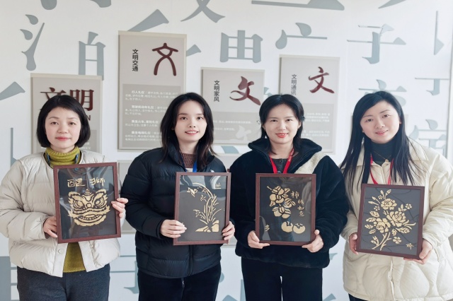 在烧箔画活动中,女老师们纷纷亲自动手,深入体验烧箔画的独特魅力。金箔在纸张上闪烁着璀璨的光芒,仿佛在诉说着古老而神秘的故事,将参与者带入一个宁静而深远的境界,让时光在这一刻仿佛变得缓慢而悠长。每一笔每一划,勾勒出轮廓;每一粘每一扫,铺陈色彩。通过一系列的绘图、上胶、贴箔、扫箔、封层、装裱等工序,一件件光彩夺目的作品得以诞生。