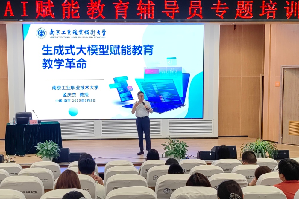 为推动人工智能技术在学生管理工作中的创新应用,提升辅导员队伍的信息化素养和工作效能,6月9日下午,我校特邀南京工业职业技术大学孟庆杰教授开展题为《生成式大模型赋能教育教学革命》的专题培训。本次培训旨在帮助辅导员掌握前沿AI技术,优化学生管理、教学科研等工作流程。