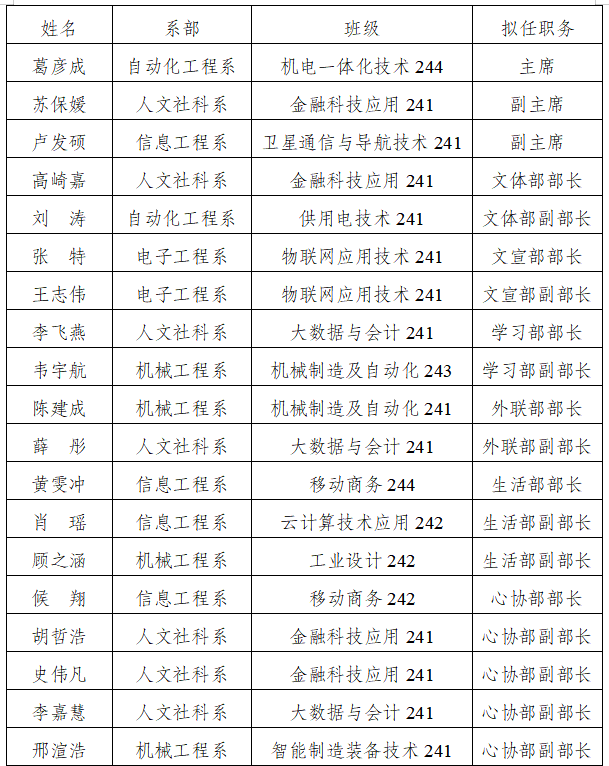 根据《江南网页版学生会章程》相关规定,为切实加强学生干部队伍建设,校学生会于2025年6月开展了第二十届学生干部换届竞选工作,经学生自主报名、组织推荐、资格审查、竞选答辩、综合考察等环节,选拔产生了拟任人选,为提高学生干部选拔的透明度,现将拟任人选的名单予以公示。