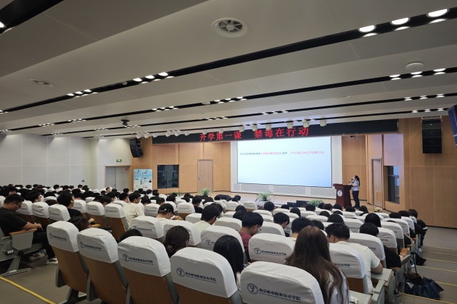 为深入贯彻落实国家禁毒工作决策部署,深化“一站式”学生社区综合管理体系建设,凝聚协同育人工作合力,增强青年学生识毒、防毒、拒毒意识,营造绿色健康、安全和谐的校园环境,2025年9月9日,由南京高职园牵头,区司法局与南京市大连山强制隔离戒毒所联合我校开展了“开学第一课:禁毒宣传进校园”专题教育活动。我校200余名学生代表参加活动。