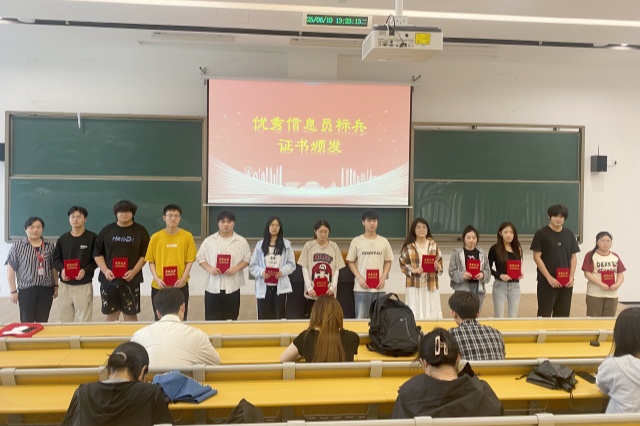 会上对2024-2025学年表现突出的学生信息员进行了表彰,吴伟萍宣读了《关于表彰2024-2025学年校级优秀学生信息员的决定》,并为“优秀信息员标兵”和“优秀信息员”颁发了荣誉证书及奖品,勉励他们再接再厉,发挥模范带头作用,带动更多同学参与社区治理。