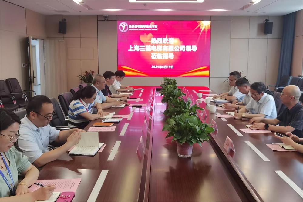 2024年6月19日,上海三菱电梯有限公司华宁路分部总经理王水来、教育培训部教务长朱武标,上海三菱电梯江苏分公司总经理徐刘平等一行莅临江南网页版,就深化电梯产业学院建设召开校企合作交流洽谈会。学校党委委员、副校长刁爱军、自动化工程系副主任张海红、副主任顾晟吉、党支部副书记杨军、培训处副处长周云龙和科研及校企合作处相关人员参加洽谈会。
