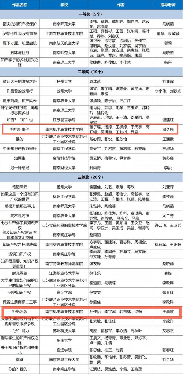 根据《关于开展2021年江苏省大学生知识产权赛事活动的通知》要求,经个人申报、竞赛组委会审核、省知识产权局组织专家评审,在2021年江苏省大学生知识产权竞赛活动创意视频比赛中,我系潘久伟老师指导的《机电新事件》获得二等奖,王晨歌老师指导的《拒绝盗版》获得三等奖。