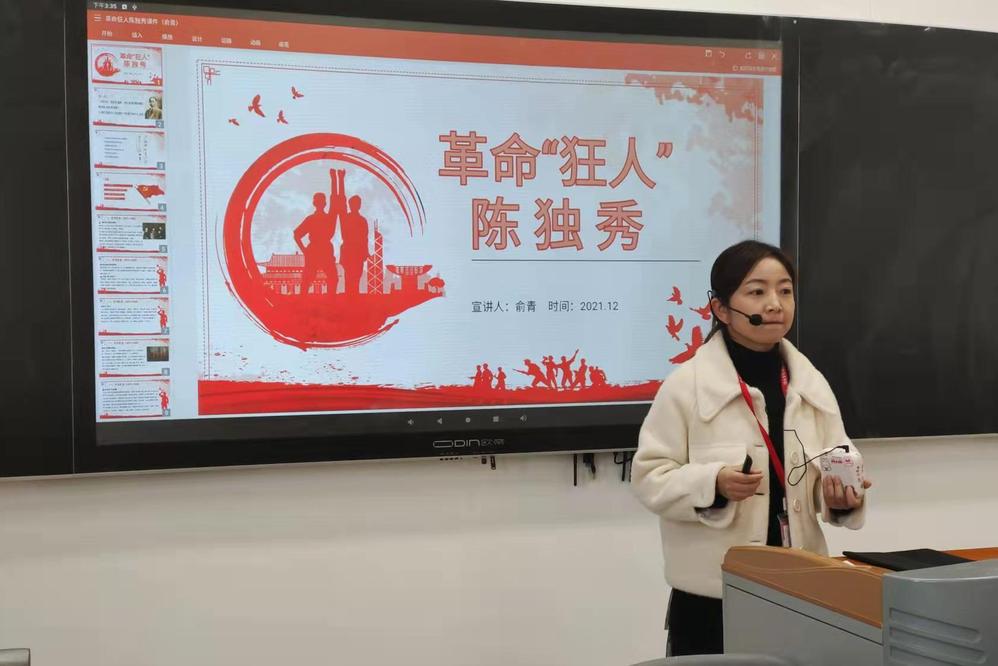 12月3日下午,根据我系党员教师“一人一党课,让红色故事入脑入心”活动,自动化工程系辅导员俞青老师以革命“狂人”陈独秀为主题,在电气203团支部上了一堂生动的专题党课。