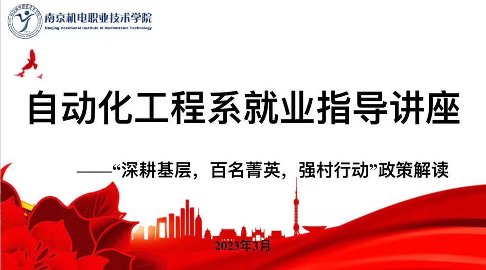 为帮助就业学生正确认识当前就业形势、明确就业目标、提升求职技能,拓宽就业渠道,鼓励优秀学子投身乡村建设,加快推进乡村人才振兴,3月26日,自动化工程系开展“深耕基层,百名菁英,强村行动”的就业指导讲座,此次讲座邀请了盐城市人力资源和社会保障局的负责人卞忠玲担任主讲,系部高水冕书记、于靖欢老师、辅导员代表和2020、2021级全体学生参加了此次讲座。