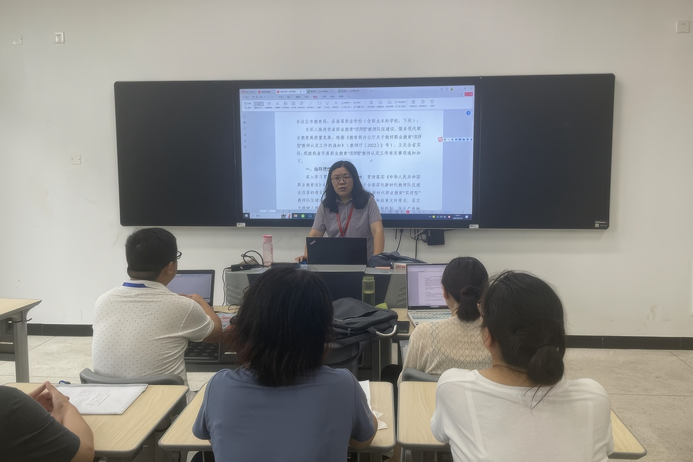 为深入推进本专业新时代职业教育“双师型”教师队伍建设,根据《省教育厅关于开展职业教育“双师型”教师认定工作的通知》(以下简称《通知》)(苏教师函〔2023〕31号)文件精神,电气自动化技术教研室于11月2日,在博学楼108开展“双师型”教师认定教研会,会议由李银露老师主持,全体专业教师参会。