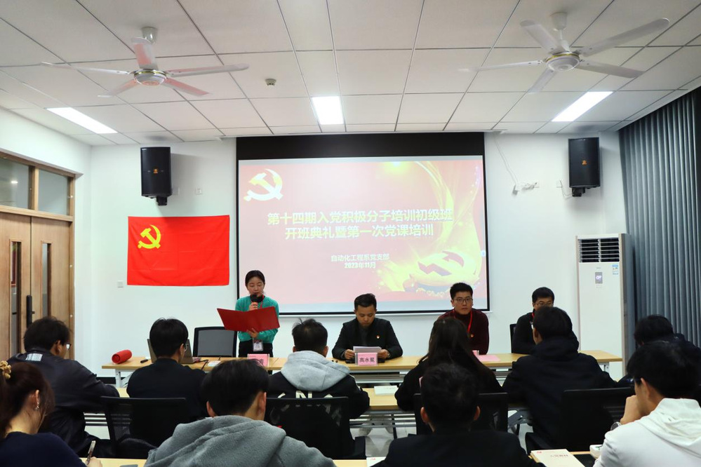 为学习贯彻党的二十大精神,教育引导入党积极分子端正入党动机,11月14日晚,自动化工程系第十四期党校初级班开班典礼暨第一次党课培训于敏行楼401准时举行。此次开班典礼由我系党支部组织委员俞青主持,党支部副书记高水冕参加本次典礼,并作为第一课主讲人。参加本次典礼的还有党支部宣传委员潘久伟、党支部青年委员唐建伟。
