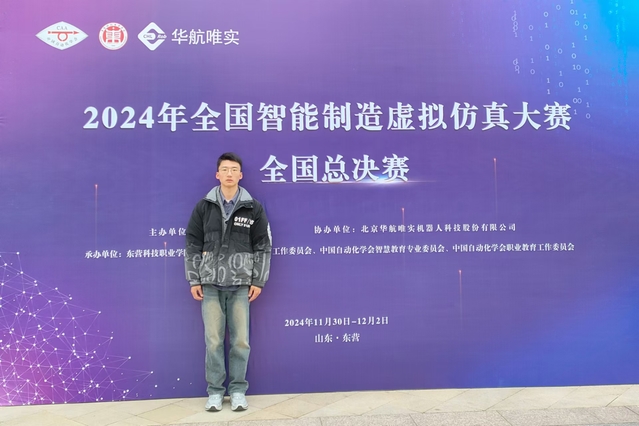“2024年全国智能制造虚拟仿真大赛”全国总决赛于11月30日-12月2日在山东东营科技职业学院举行。本赛项由中国自动化学会主办,东营科技职业学院、中国自动化学会教育工作委员会、中国自动化学会智慧教育专业委员会、中国自动化学会职业教育工作委员会承办,北京华航唯实机器人科技股份有限公司协办。竞赛采取资格赛、省选拔赛、全国总决赛三级赛制模式,总决赛阶段共有来自全国25个省份多所中、高职院校160余名选手参加。我校机电一体化专业学生张淮阳在叶泉老师的指导下以省赛一等奖的成绩突出重围入围决赛,并在全国总决赛高职组中获得金牌(第1名)的优异成绩。