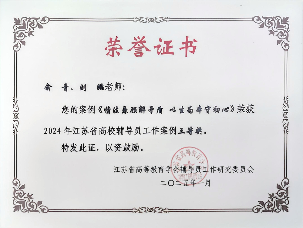 日前,江苏省高等教育学会辅导员工作研究委员会组织开展了全省高校辅导员工作案例评选工作。经自动化工程系党支部统稿、学校推荐、形式审查、专家评审,辅导员俞青、刘鹏合作完成的辅导员工作案例《情法兼顾解矛盾 以生为本守初心》获评省级三等奖。本次获奖,实现了辅导员工作案例省级获奖成果零的突破。