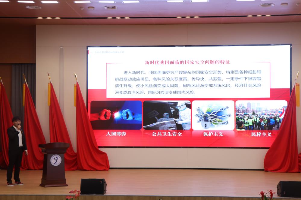 六组学生同台竞技,多维度诠释国家安全。活动第二篇章掀起国家安全教育热潮,六组学生代表围绕“理论宣传·学习贯彻总体国家安全观”“法治宣教·学习贯彻新修订《中华人民共和国反间谍法》”等主题展开演讲。他们用专业的知识、生动的案例,深入浅出地讲解国家安全知识,涵盖政治安全、网络安全等多个领域,让同学们对国家安全有了更全面、深入的认识。