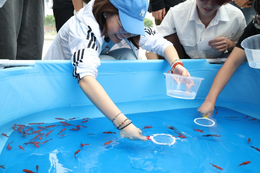 活动现场气氛热烈,同学们围在水族箱旁,手持纸网,眼神专注地锁定目标金鱼。纸网在水中上下翻飞,试图捕捉那灵动的小生命。每成功捞起一条金鱼,现场便响起阵阵欢呼;即使偶尔失败,同学们也毫不气馁,调整策略再次尝试。欢声笑语回荡在活动现场,同学们沉浸在这简单而纯粹的游戏中,平日里的烦恼与压力似乎都被抛到了九霄云外。此刻的他们全身心地享受着当下的欢乐时光,彼此之间的距离也在不知不觉中拉近,陌生的面孔逐渐熟悉,交流愈发热络。