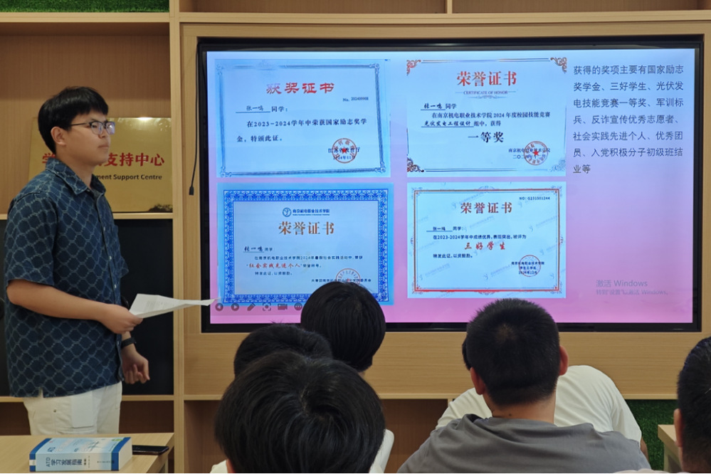 张一鸣同学以《奋斗者,正青春》为题,从“专业学习、科技创新、社会实践”三个维度分享了成长历程。“国家励志奖学金不仅是物质支持,更是精神激励的里程碑。它时刻提醒我,唯有持续奋斗才能浇灌出理想之花。”谈及获奖感受时,他特别提到疫情期间参与社区志愿服务的经历,“当看到专业所学能切实解决防疫设备的调试难题,我深刻体会到知识报国的真谛。”通过展示专业竞赛获奖证书、社会实践影像资料,他生动诠释了“将知识转化为力量,让青春绽放担当”的成长理念。