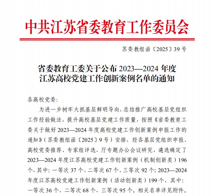 近日,省委教育工委公布2023-2024年度江苏高校党建工作创新案例名单,我系党支部的《构建三维联动机制 以高质量党建引领高质量发展》项目荣获机制创新类三等奖。